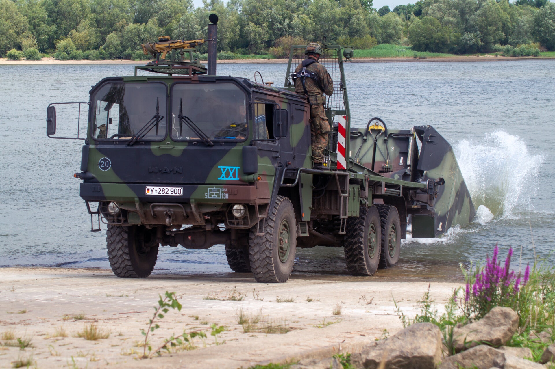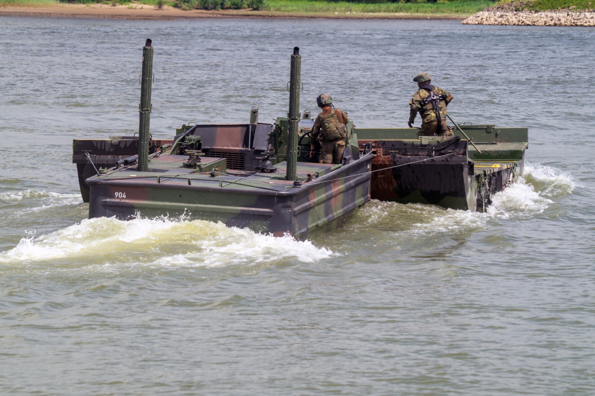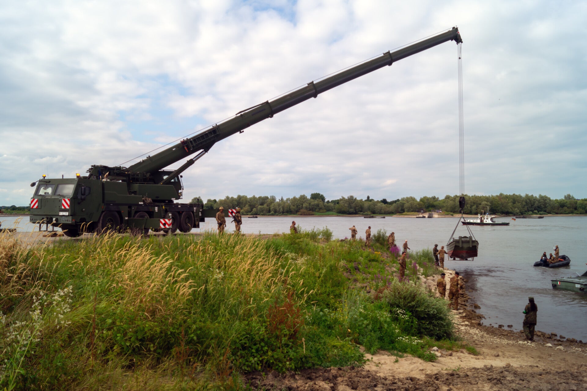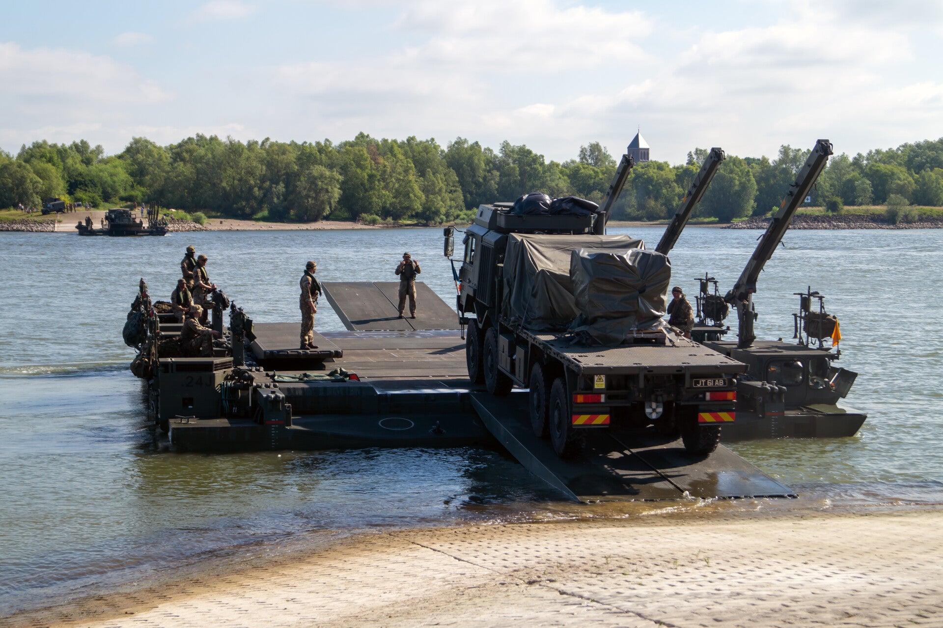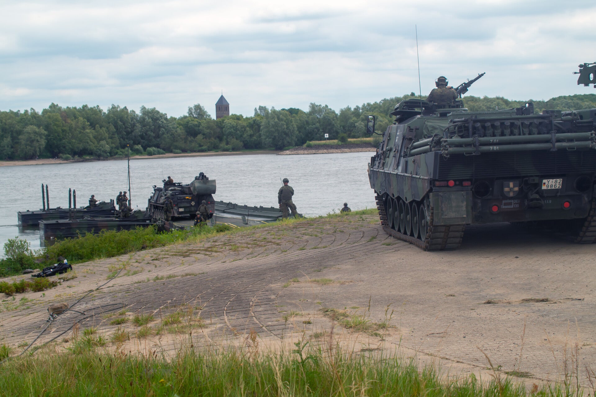 28-06-2025 the Rhine was crossed at 2 different locations near Kalkar with multiple ferries. An exercise with approximately 1200 soldiers and 500 vehicles participated in this multinational exercise named Grand Crossings. Italy, Germany, the Netherlands and Great Britain all brought a bridge construction company to the exercise.